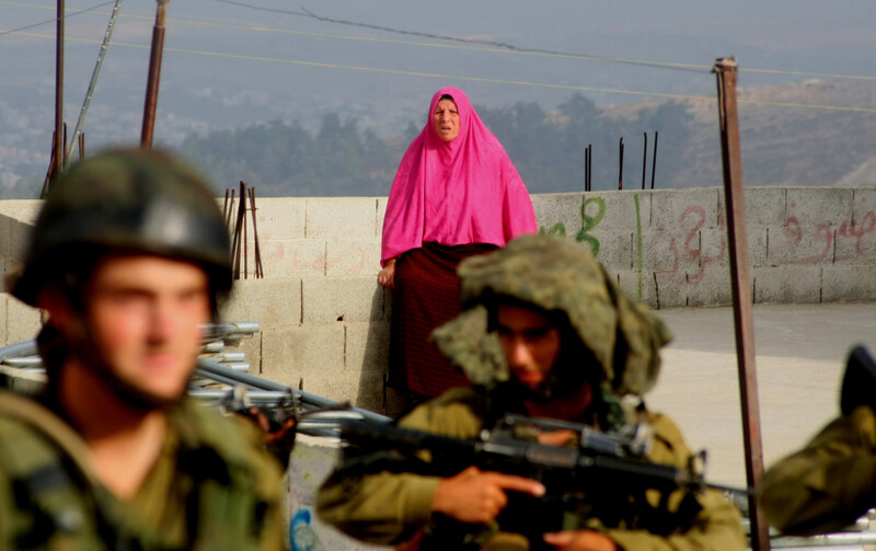 A Palestinian woman observes Israeli troops in the West Bank village of Beit Ola, near Hebron, 21 June.