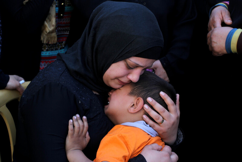 The wife and son of thirty-year-old Muhammad Tarifi, who was shot dead during early morning clashes with Israeli troops, mourn during his funeral in the West Bank city of Ramallah, 22 June.