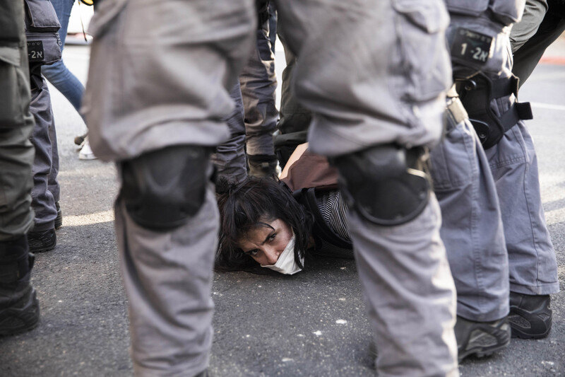 A Palestinian woman is detained during a protest against Israeli police violence in East Jerusalem on 9 July.