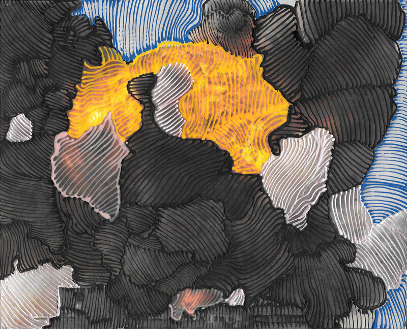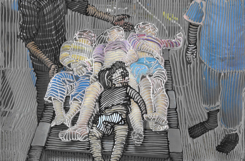 “I felt it was really important that the viewer can ‘dive into’ the scene,” Scholnick commented via email. “At first you are drawn in by the mark-making but what is uncovered with deeper viewing is the atrocities that were committed.”