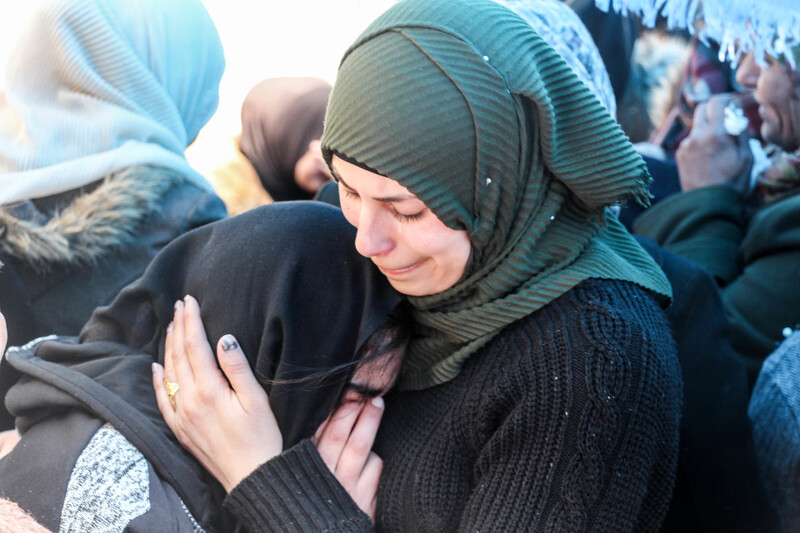 Relatives mourn during the funeral of Muhammad Dar Adwan during his funeral in Qalandiya refugee camp, 2 April. Dar Adwan was shot and killed by Israeli occupation forces during a raid on the camp earlier in the day.