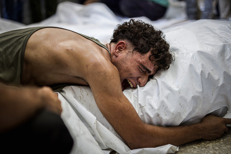 A Palestinian mourns a loved one killed in an Israeli attack, Al-Aqsa Martyrs Hospital, central Gaza Strip, 12 August.