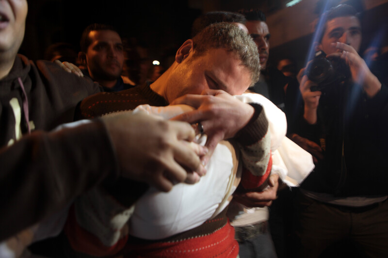 Omar Jihad Mashrawi holds his one-year-old son who died from injuries sustained during an Israeli military attack on Gaza, al-Shifa hospital, Gaza City, 14 November.