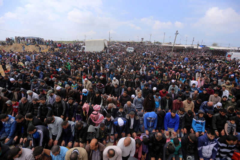 Muslim worshippers perform Friday prayers during Great March of Return protests on 30 March. Israeli Defense Minister Avigdor Lieberman says there are no innocent people in the Gaza Strip.