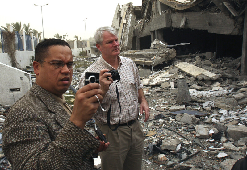 US Rep. Keith Ellison of Minnesota, left, and then-Rep. Brian Baird of Washington, take photos of the rubble of the American International School in the northern Gaza Strip in February 2009, after it was destroyed by bombing during Israel’s assault on the coastal territory the previous month.