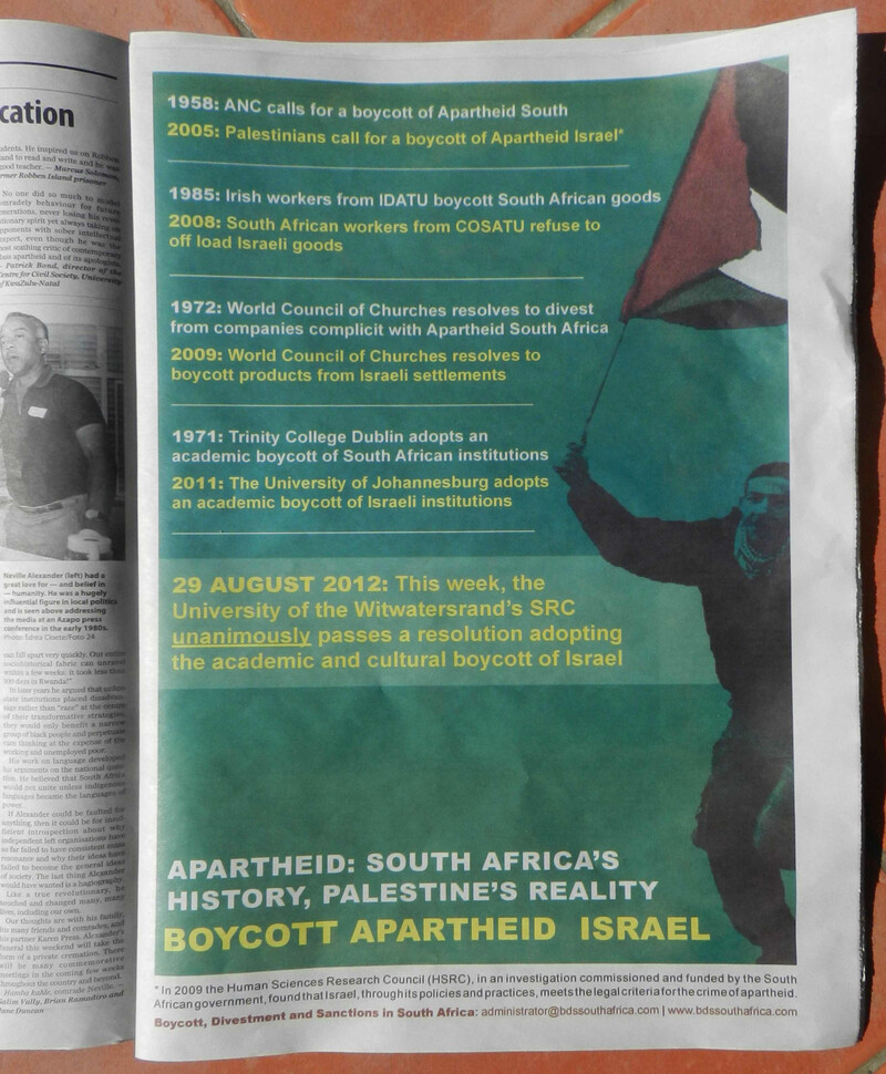 … The BDS movement against Israel is historically based and exemplified in our own South African history and the fight against the institutionalised racism of apartheid. Throughout the world students joined people of conscience in opposing the regime which systematically perpetrated racial injustice in South Africa. Because of our history of apartheid, as South Africans, we must unite and stand in solidarity with those who face similar oppression. Several prominent South African leaders have said that what Israel is doing to Palestinians is an even more brutal form of apartheid than the apartheid experienced here in South Africa.