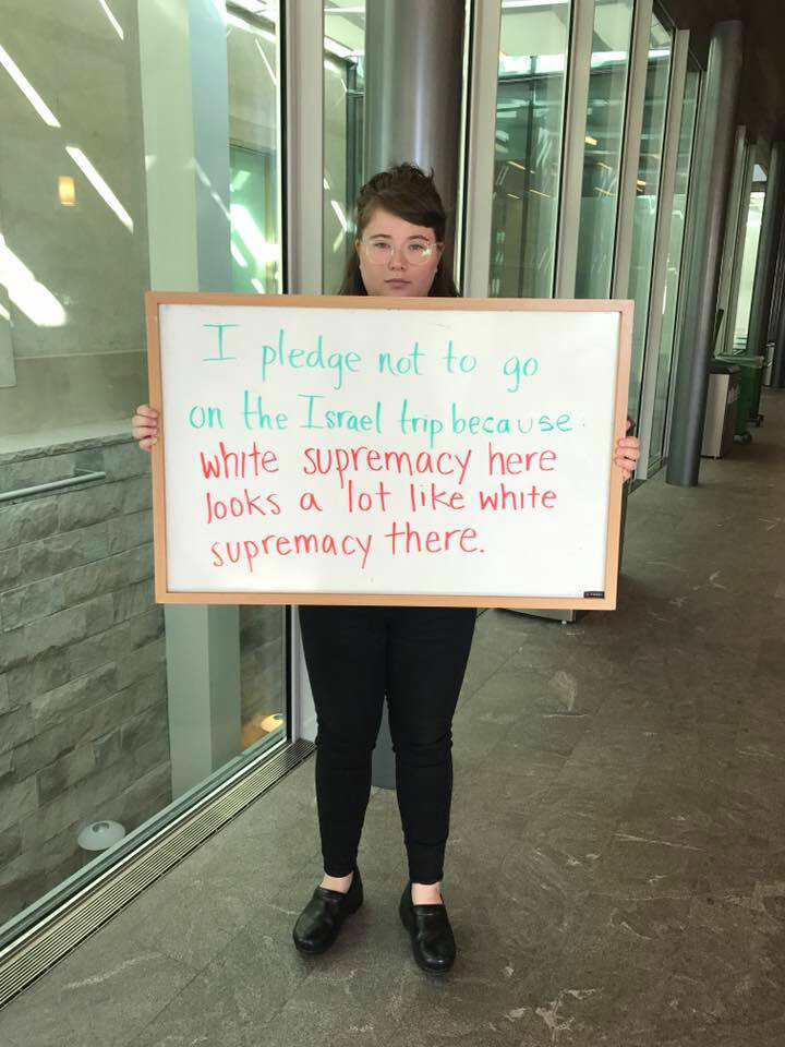 He added that even though the stated goal of the action is to urge classmates to commit to not participating in the trip, it is also “to politicize the trip, to politicize the issue.”