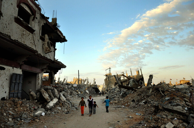 Palestinian children walk past destroyed houses in Shujaiya, eastern Gaza, which was heavily bombed by Israel in July and August.