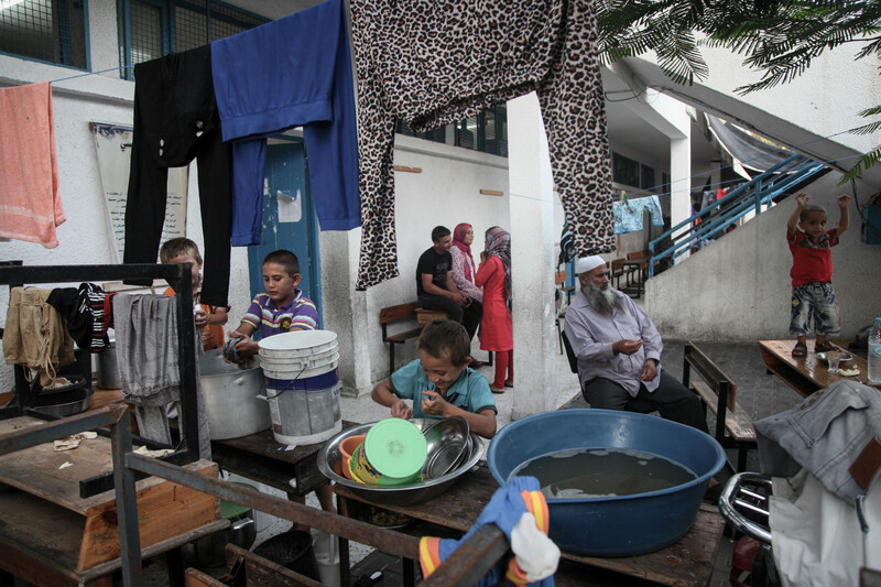 Internally-displaced Palestinian children wash clothes at a United Nations school that has been turned into a temporary shelter in Gaza City.