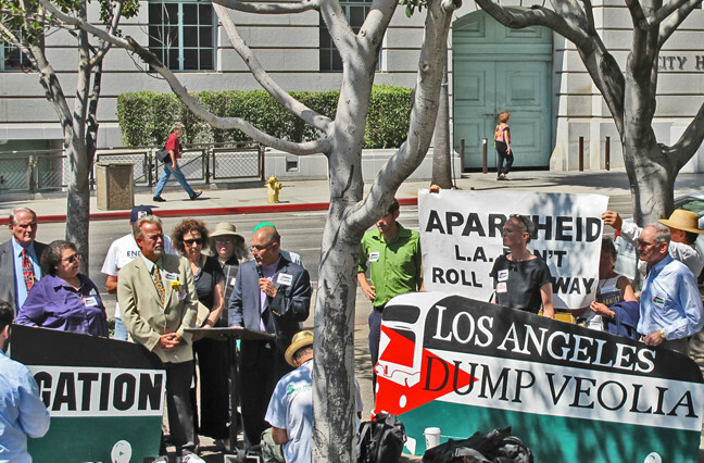 Dump Veolia added that more than 500 postcards, petition signatures and letters “from groups and individuals opposed to the awarding of this contract were submitted to the committee. … Those making statements included representatives of Jewish Voice for Peace and the Los Angeles County Green Party. Speakers included Christian clergy members, Anti-war organizers, Immigration-Rights organizers, Human Rights lawyers, and Labor Organizers. Speaking against Veolia were members of the African-American, Chicano/Mexican, Jewish and Muslim communities in Los Angeles, as well as both Christian and Muslim Palestinians.”