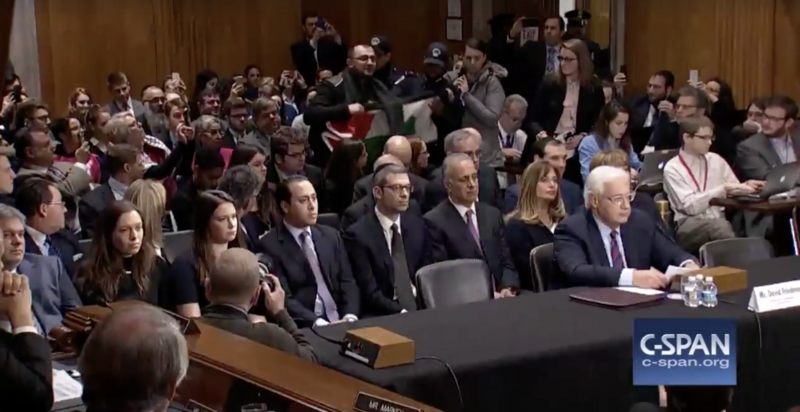 During the hearing, El-Hosseiny stood up and shouted that Friedman’s appointment as Israel envoy would provoke more violence because of his support for settlement expansion.