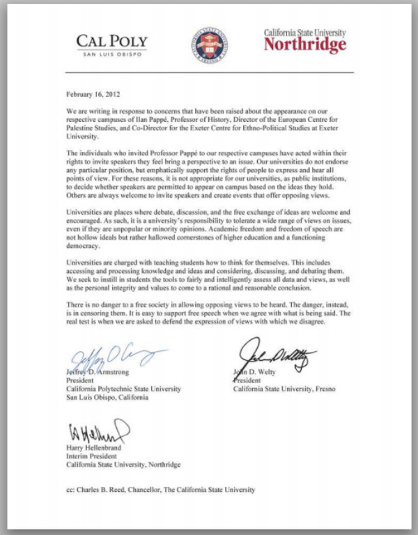 Please understand that we are NOT asking that these three events be cancelled or that Ilan Pappe be censored. Rather, we are calling on you to rescind all CSUF, Cal Poly, and CSUN sponsorship and support from the Ilan Pappe events, for the following reasons: