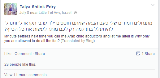 Edry’s Facebook timeline shows a pattern of calls for bloodshed against Palestinians. Writing about the murdered sixteen-year-old Muhammad Abu Khudair, who was kidnapped and burned alive by Israeli youth, she stated: “Sweet settlers, next time you kidnap an Arab boy, call me and let me torture him!! Why do you get to have all the fun?”