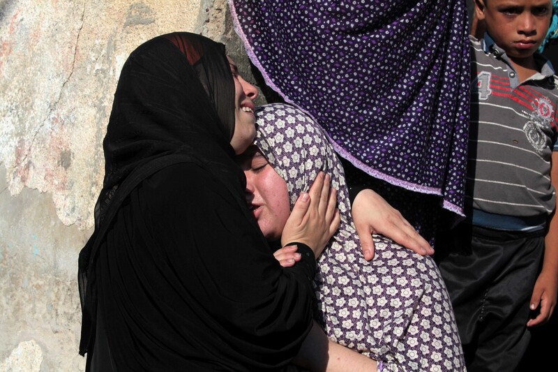 Relatives of four boys from the Baker family comforted each other after hearing that the children were killed by Israeli shelling of a Gaza City beach, 16 July 2014.