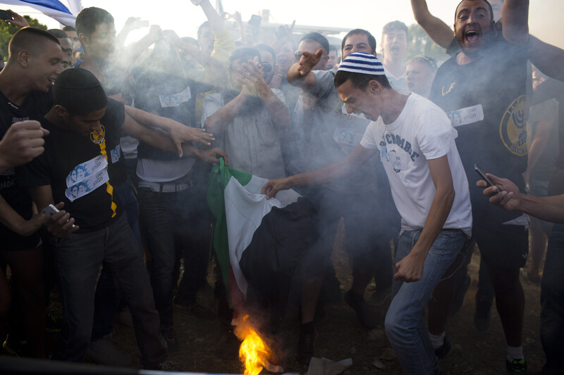 Israelis burn a Palestinian flag and shout racist slogans, during an anti-Palestinian protest at the Gush Etzion junction in the occupied West Bank, 16 June.