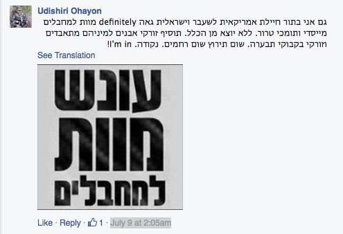 Udishiri Ohayon, who identified as a US military veteran, said, “I too, as a former US soldier and a proud Israeli definitely death to terrorists, founders and supporters of terror. Add in various stone throwers, suicide-committers, and firebomb throwers. No excuse, no pity. I’m in!”