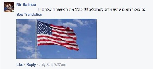Nir Balinco shared an image of the US flag with the comment, “All of us also want a death penalty for terrorists!!!! Including their family!!!”