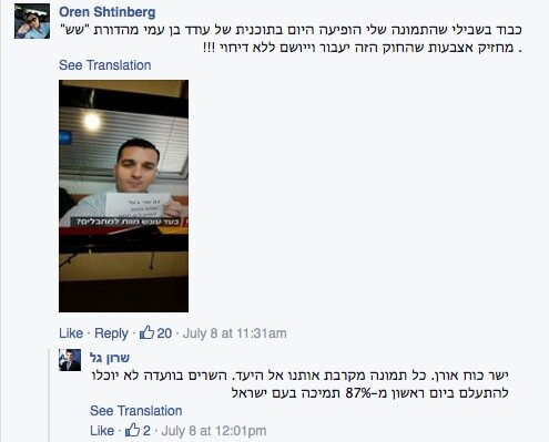“I’m honored to have had my photo appear today on Oded Ben Ami’s six o’clock news show. I’m crossing my fingers that this law will pass and be implemented without delay!!!” wrote Shtinberg in a Facebook post. Gal replied, “More power to you, Oren. Every photo brings us closer to the goal. The ministers in the committee will not be able to ignore 87 percent of support among the nation of Israel on Sunday.”