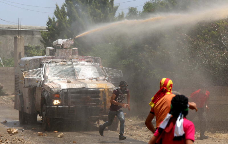 Israeli vehicle spraying the foul-smelling ”skunk” at Palestinian protesters in the West Bank village of Kafr Qaddum, near the city of Nablus in May.