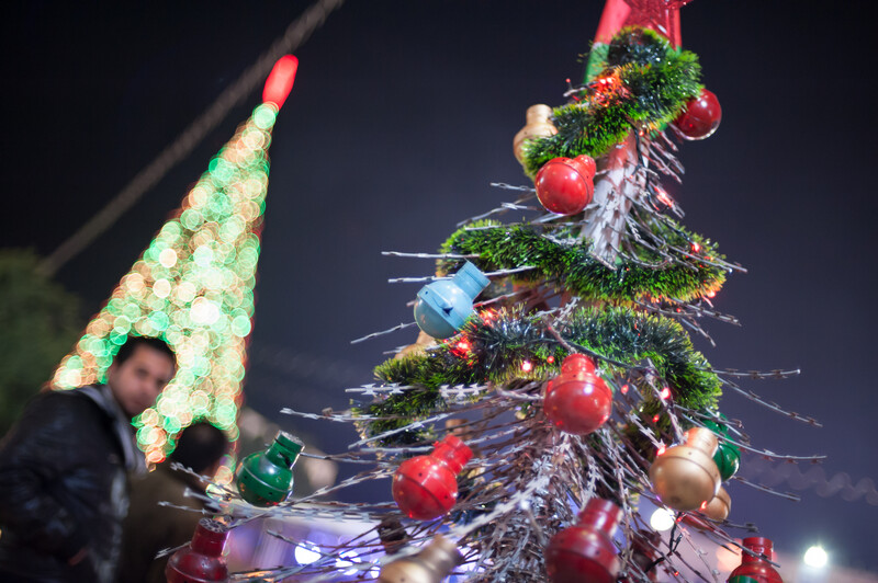 A tree made of razor wire and decorated with tear gas canisters in Bethlehem’s Manger Square, December 2013.