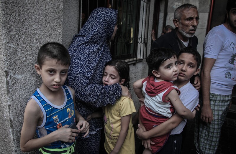 A family evacuates its home in response to Israeli air strikes on Gaza City yesterday; campaigners in Scotland say there is widespread revulsion against the attacks on Palestinians.