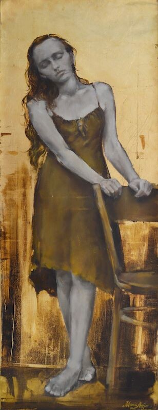 “Untitled,” 2015 by Marwa al-Najjar. Oil and gold leaf on canvas, 135 x 50 cm. (Zawyeh Gallery)