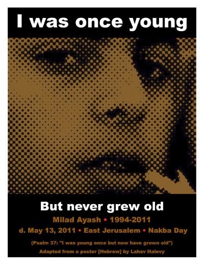 Silwan residents were demonstrating outside an illegal settler home in the Beit Yonatan neighborhood of East Jerusalem – the site of yet another eviction by radical settlers attempting to Judaize that part of the city – when a window suddenly opened from the settler lair and shots rang out, leaving Milad to drown in his own blood. (See the photos of Milad’s funeral, taken by Mahmoud Illean.)