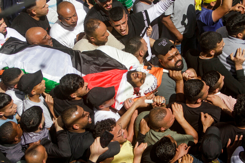 Palestinians take part in the funeral of Saed Jihad Misheh, 32, and Wasim Adnan al-Araj, 19, both shot by Israeli occupation forces in the Balata refugee camp in the northern West Bank city of Nablus on 13 May.