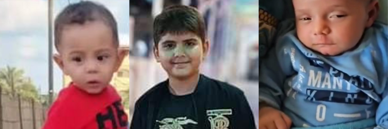 From left to right, Abd al-Nasir Ahmad Shamlakh, 2, Yazan Ahmad Shamlakh, 10, and five-month-old Omar Ahmad Shamlakh, three brothers killed in an Israeli attack on a residential building in Gaza City on 8 October.