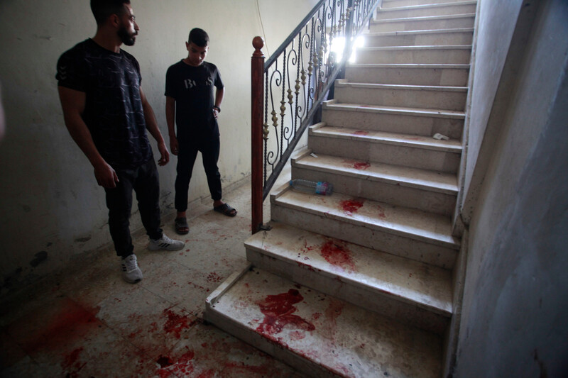 Palestinians inspect blood on the staircase of a building after Israeli forces surround a wedding hall during an Israeli military raid in the Balata refugee camp, near the West Bank city of Nablus on 3 June.