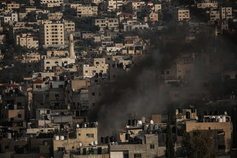 Smoke billows above the Jenin refugee camp skyline in the northern occupied West Bank on 24 January 2025.