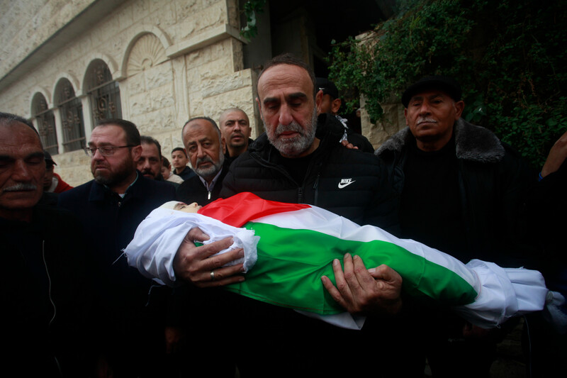 Mourners carry the body of 2-year-old Laila Muhammad Khatib, who was shot in the back of the head at home while having dinner with her family, in Jenin in the occupied West Bank on 26 January.