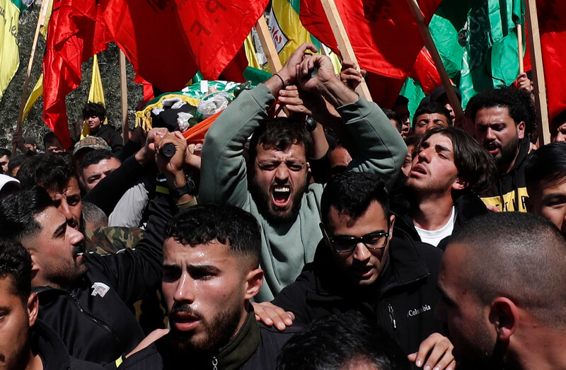 Mourners carry the body of Amer Al Najar during his funeral in Burin village near Nablus, 5 March 2024.