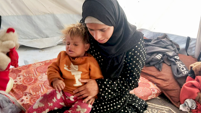 Yasmin Abu Namous and her daughter Tahani in their tent in Khan Younis in the Austrian Cemetery.