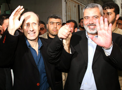 BBC reporter Alan Johnston and the deposed Palestinian Prime Minister, Ismail Haniyeh, raise their hands following Johnston’s release in Gaza City early Wednesday, 4 July 2007. Johnston, the BBC reporter held hostage in the Gaza Strip since 12 March, was handed over before dawn Wednesday to Hamas officials by his captors from the Army of Islam. (Wissam Nassar/MaanImages)