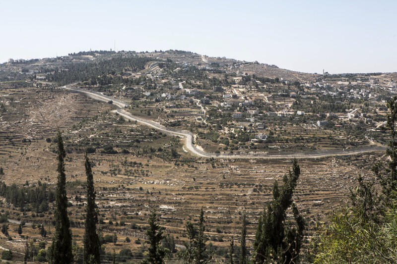 A view of the new village of al-Walaja from the opposite hill. A newly constructed barbed-wire fence, several meters high, separates residents from their agricultural lands. When completed, this structure, part of Israel’s wall in the West Bank, will totally surround the village and will likely force many to leave.