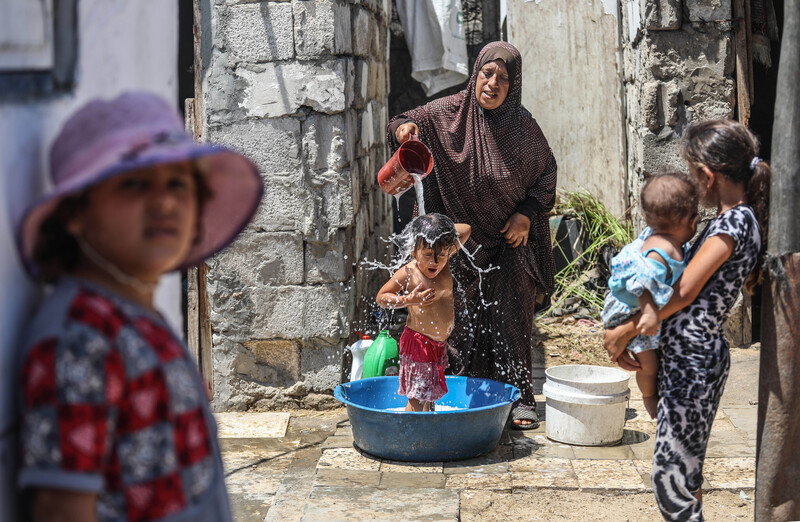 A Palestinian woman bathes a child outside their home in Nahr al-Bared refugee camp in Khan Younis, southern Gaza Strip, August 2019.