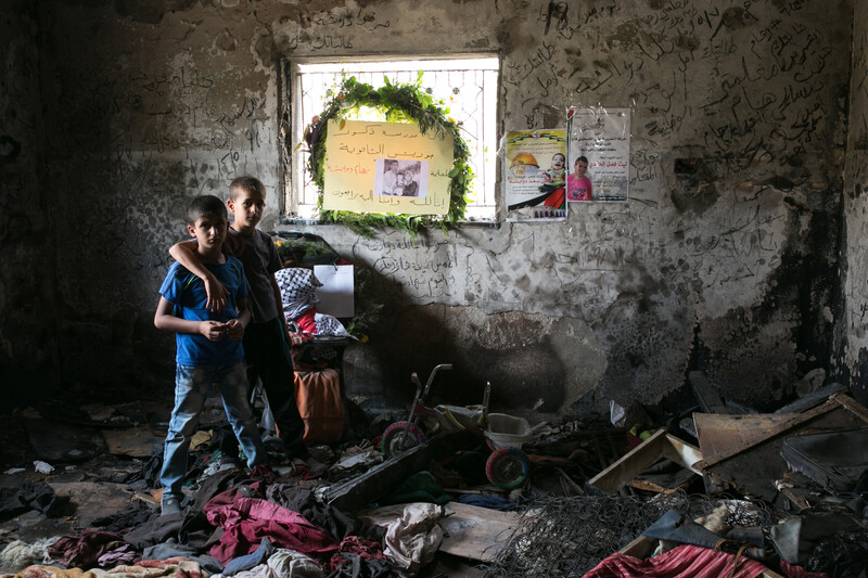 Children stand in the burnt home of the Dawabsheh family before the funeral ceremony of Riham, who died of her injuries more than one month after the arson attack by suspected Jewish extremists that killed her 18-month-old baby Ali and her husband Saad, 7 September.