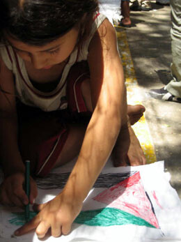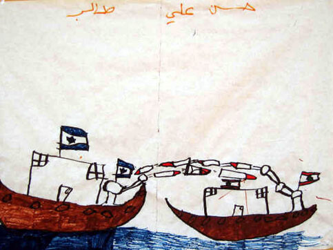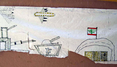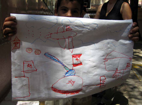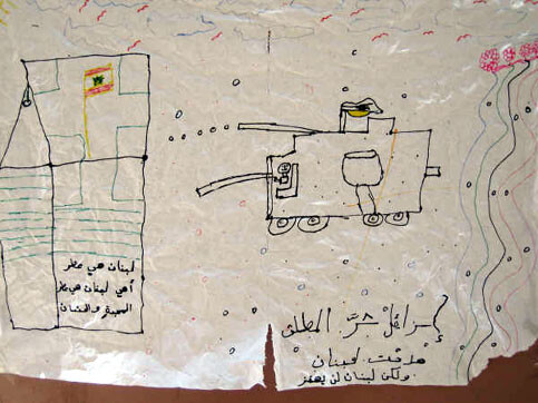In most of the drawings, it was Israeli war machines. Just one child drew a picture of the “shatyouka missiles” — meaning katyusha — of the resistance hitting back at the Israelis.