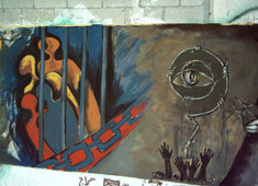 A mural in Gaza that depicts scenes of horror and despair intimately wrapped up in the issue of the occupation and that of prisoners. (Eóin Murray)