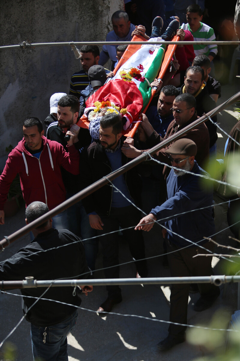 The body of Iyad Sajadiyya, wrapped in a Palestinian flag, is carried through the alleys of Qalandiya refugee camp during his funeral on 1 March.