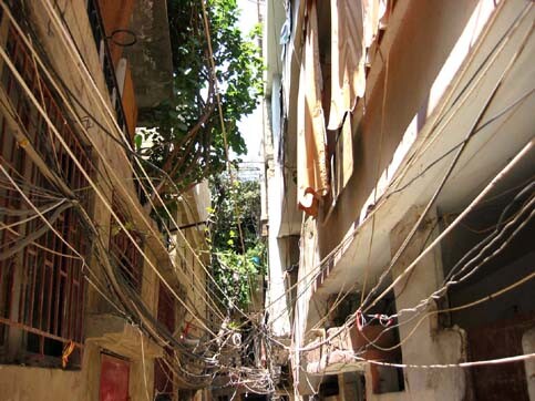 Electricity wires hanging over an ally of Ein el-Hilweh refugee camp in Southern Lebanon. [Photo: Stefan Christoff EI]