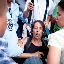 Despite this, they had no trouble boarding an Aegean Air flight from Athens which arrived at Ben Gurion Airport at 4:30am on Monday, 11 July. “I think we took them totally by surprise,” says Hale. “When they said, ‘What is the purpose of your visit to Israel?’ And we said ‘We don’t want to visit Israel, we want to go to Palestine,’ the border official’s jaw dropped. There was absolute consternation.” As they were led to the holding area at the airport, both women called out, “We want to go to Palestine – Free Gaza! Free Palestine!”