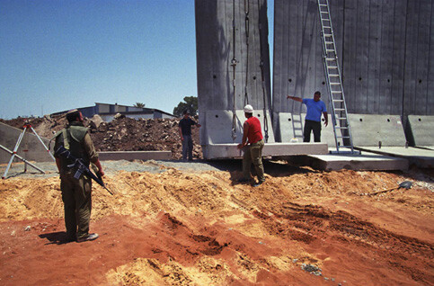 Above: An Israeli soldier watches while a construction crew puts part of Israel’s Aparthied Wall in place near Qalqiliya. (Ronald de Hommel)