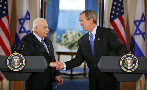 President George W. Bush and Israeli Prime Minister Ariel Sharon during a press conference in the Cross Hall of the White House on April 14, 2004. (White House)