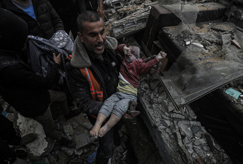 Palestinians recover the body of a child from the rubble of his family’s home following an Israeli airstrike in Deir al-Balah, central Gaza, 7 March.