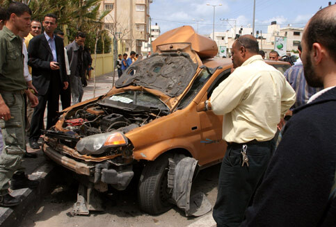 Palestinians inspect a car belonging to Mona Ghalayni after unknown Palestinians planted a bomb in it in Gaza, 18 April 2007. The car of Ghalayni, who is the owner of a famous chain of restaurants in the Gaza Strip, exploded shortly after her arrival at one of her restaurants in the south of Gaza City. (Hatem Omar/MaanImages)