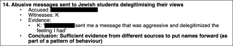 One anonymous Jewish student alleged only that they were sent “a message that was aggressive and delegitimized the feeling I had.”