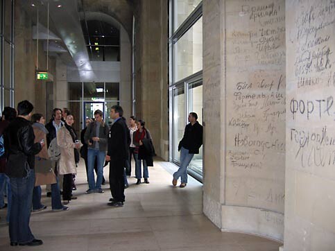 Participants in the Reichstag (Germany’s parliament) stand next to graffiti written by Soviet troops in 1945. (Photo: Victor Kattan)