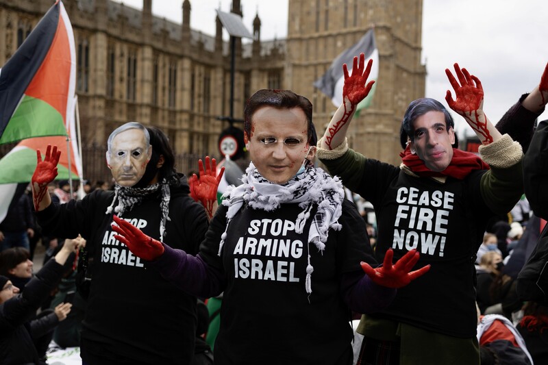Israel’s Benjamin Netanyahu and leading British politicians David Cameron and Rishi Sunak are denounced at a London protest.